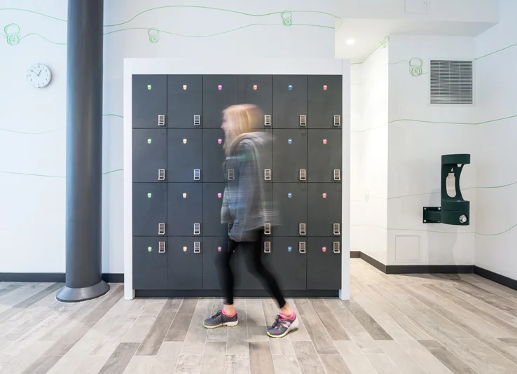 The 19th Street Studio is the flagship location for The Fhitting Room's high intensity training located in middle of the Flatiron District's fitness hub. The design focuses around integrating two levels with the main studio upstairs and a smaller, private studio downstairs. This was achieved through an open layout and consistent material selections of blackened metal screens and patterned concrete finishes.