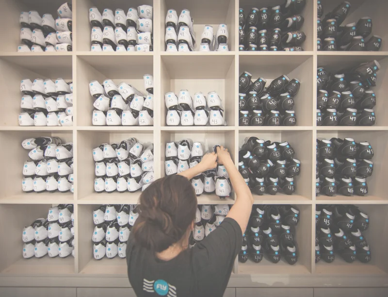 Our design for Flywheel Sport's Los Angeles location is a simple, modern layout to take advantage of the distinct angled geometry of the existing construction. We took advantage of the double height reception and seating area with custom perforated metal ceiling panels.
